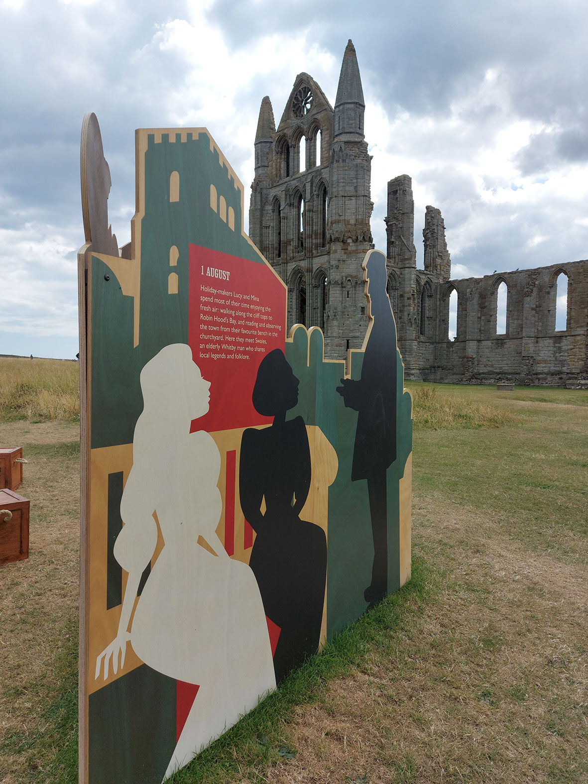 The exhibition took the form of four units consisting of shaped exterior ply panels, which are printed in full colour and white. The colour palette is deliberately restricted for impact and as a nod to book design of the era. The units are placed in the grounds of the Abbey, where visitors can clearly see the town, the Abbey itself the sea.