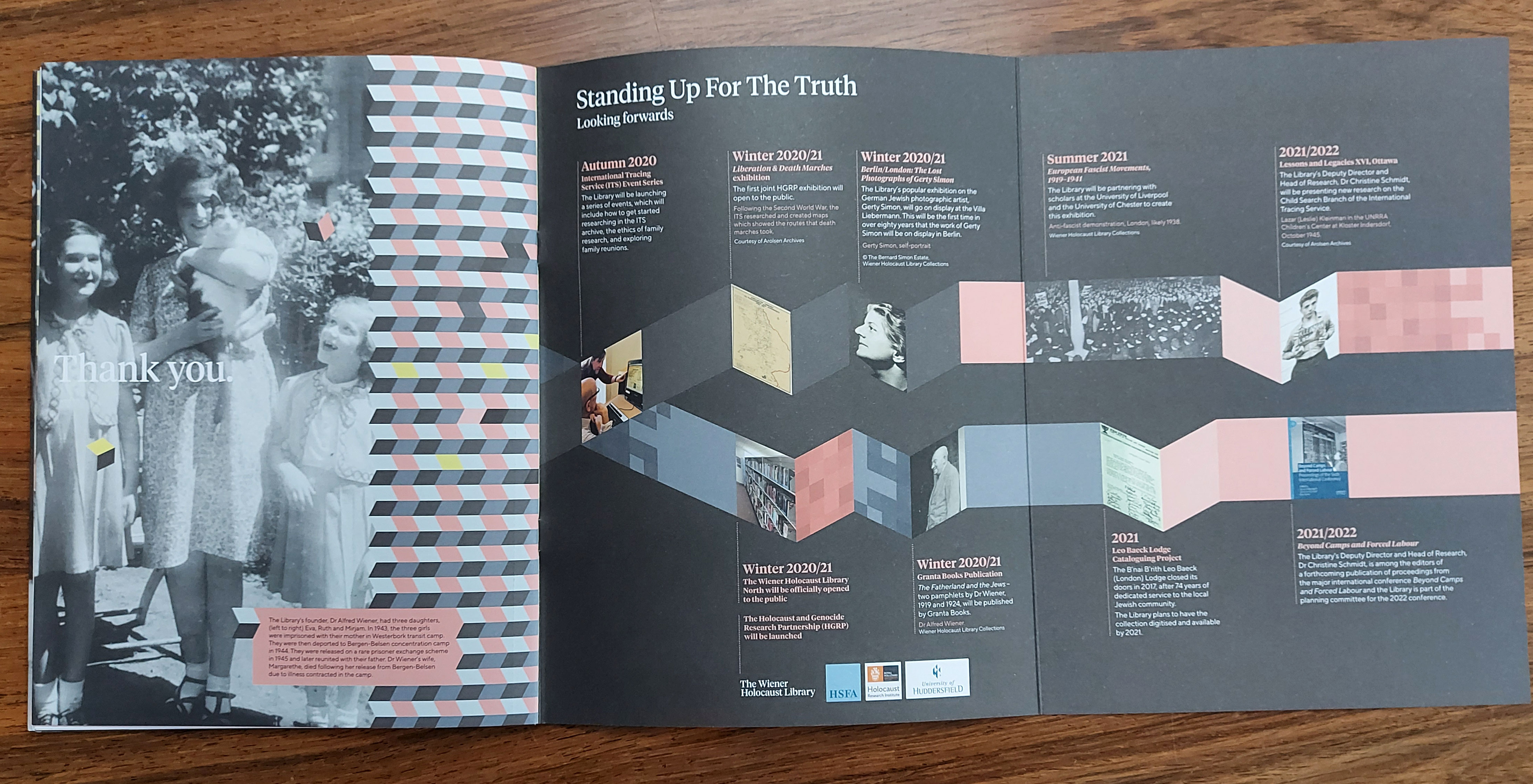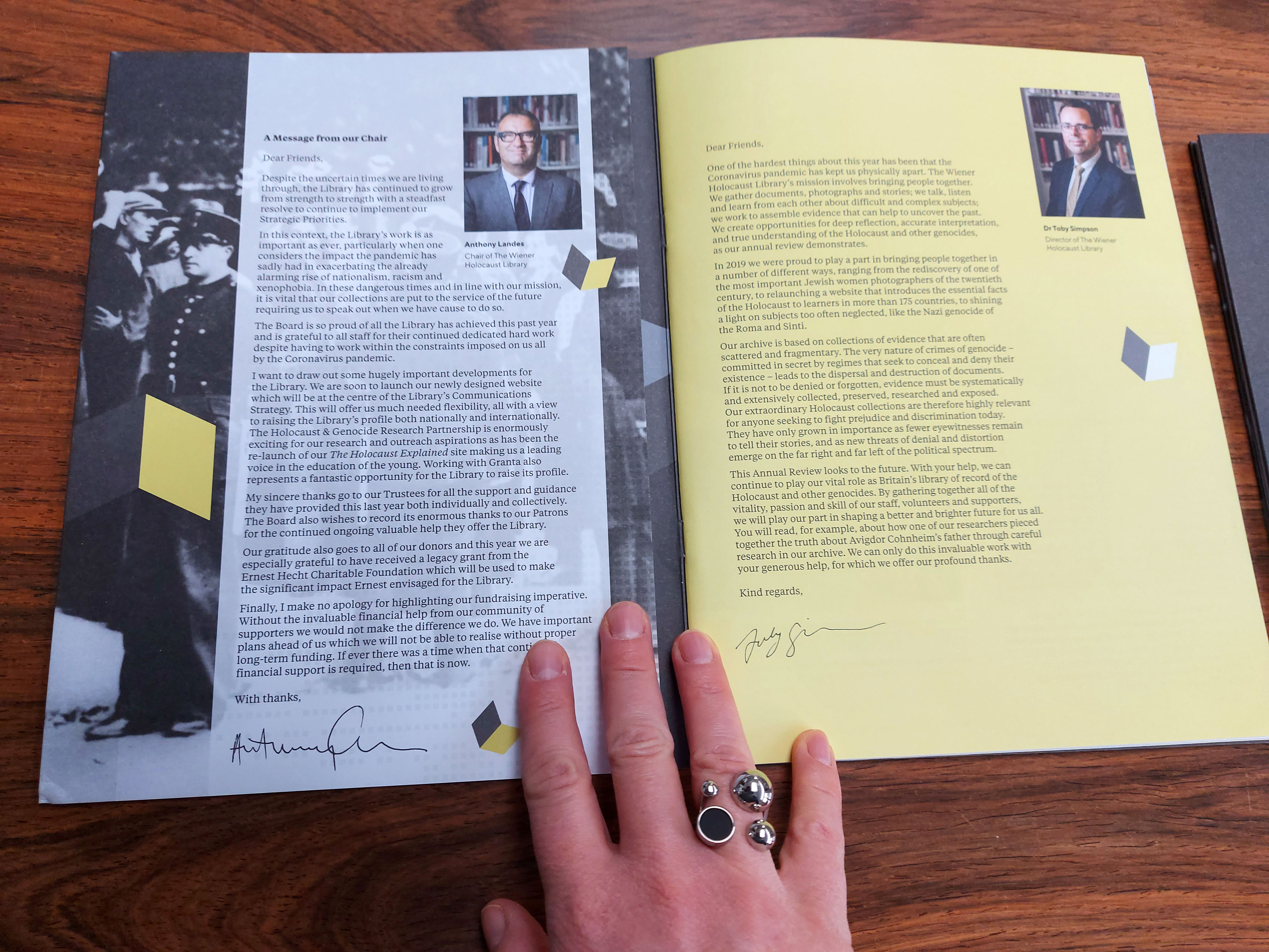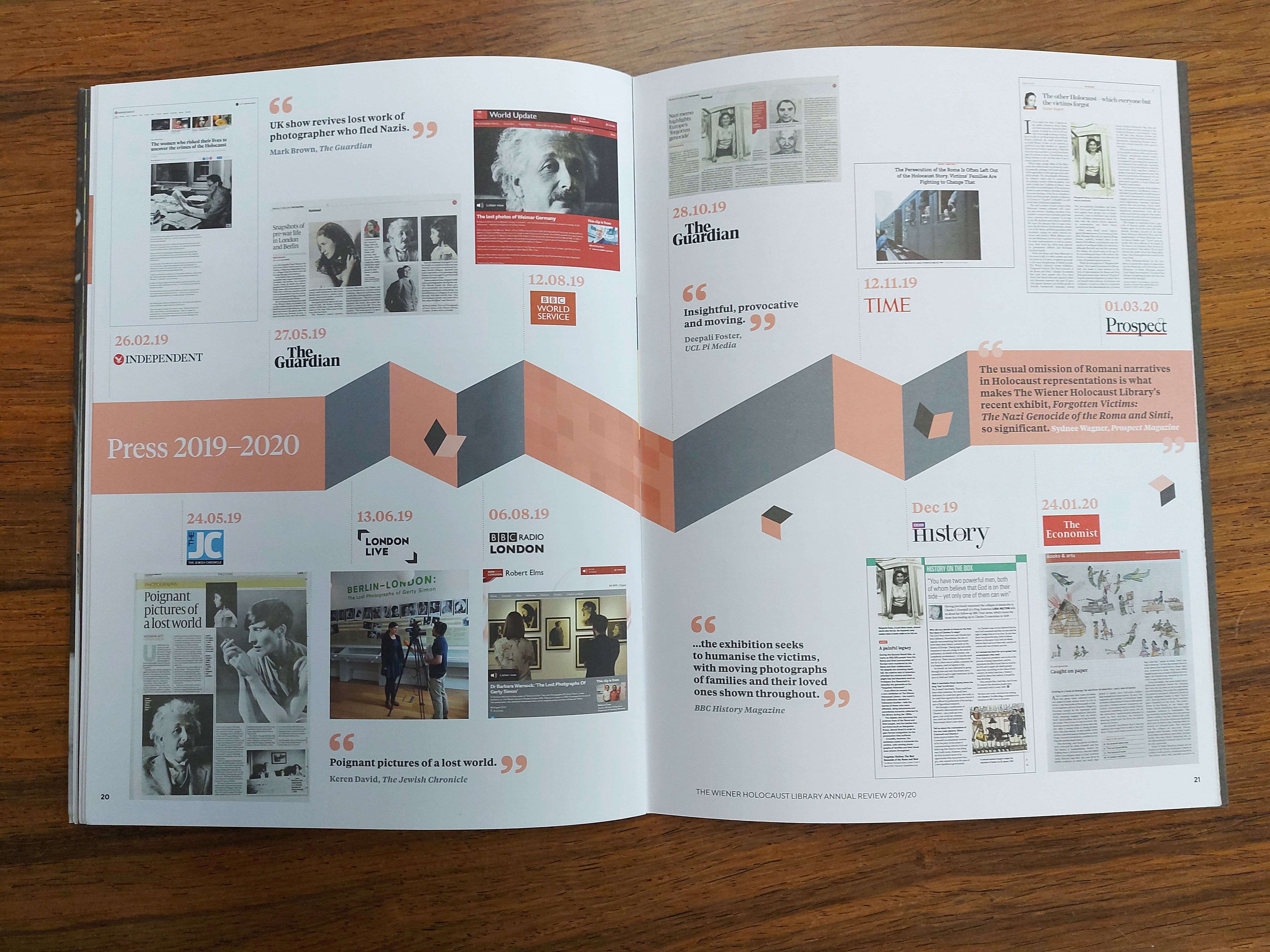 During the 2020 Covid-19 lockdowns, Bivouac designed an annual review for The Wiener Holocaust Library. It was particularly important for the Library to reach out to funders during the pandemic, so they were keen to produce something special, but not frivolous. We used uncoated stock and avoided fancy finishes, opting instead for a french-folded cover to give the document some rigidity while allowing space for creative timelines. The final document fits nicely in the hand and is very tactile.